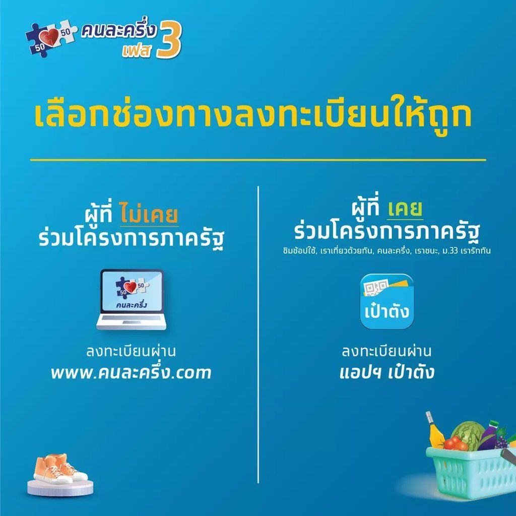 โครงการคนละครง เฟส 3 ทรฐบาลไดออกมาตรการมาเยยวยาและการฟนฟเศรษฐกจในประเทศ ทไดเรมโอนเงนรอบแรกไปแลว เมอวนท 1 กรกฎาคม 2564. เปดลงทะเบยนรานคาใหม โครงการคนละครงเฟส 3 ตงแตวนท 14 มย.